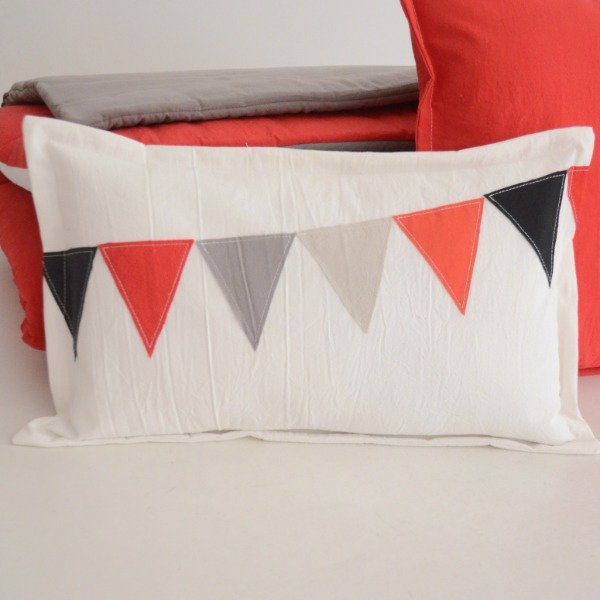 Almohadón rectangular de 30x50con detalle en la misma tela y banderines en telas surtidas a elección.