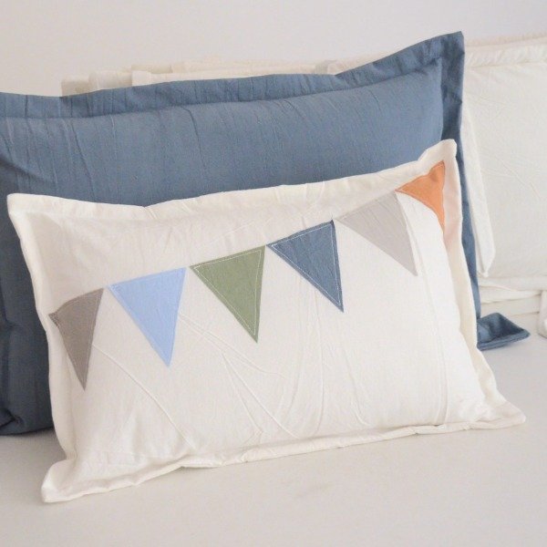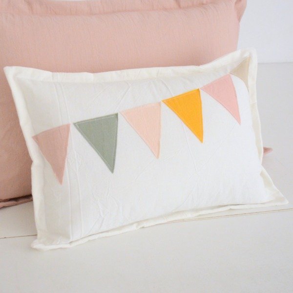 Almohadón rectangular de 30x50con detalle en la misma tela y banderines en telas surtidas a elección.